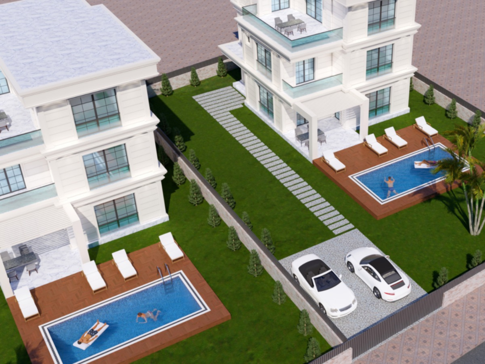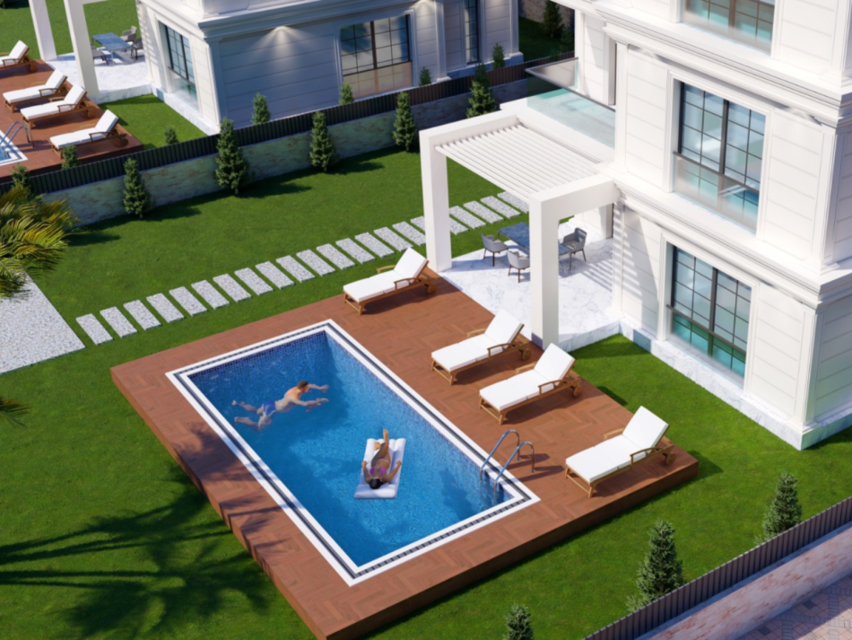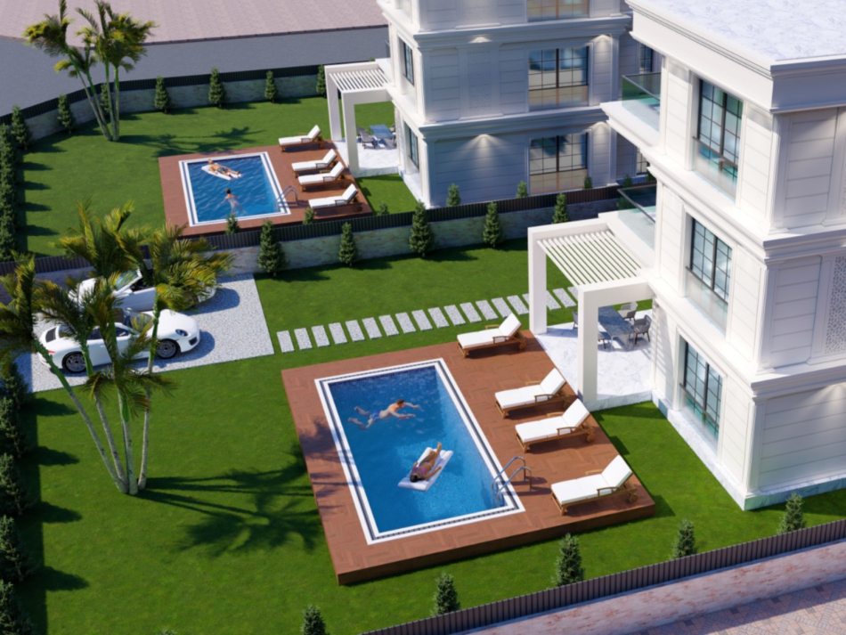Her villaya ait özel ve geniş peyzajlı bahçe alanı